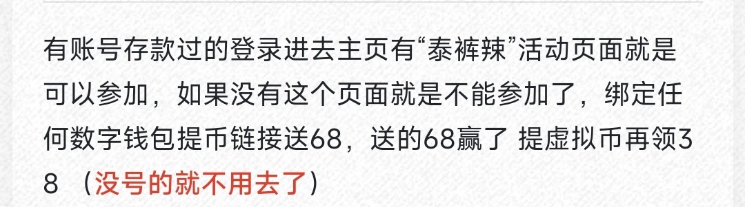 有账号存款过的登录进去主页有“泰裤辣”活动页面就是可以参加,如果没有这个页面就是不能参加了,绑定任何数字钱包提币链接送68,送的68赢了 提虚拟币再领38 (没号的就不用去了)