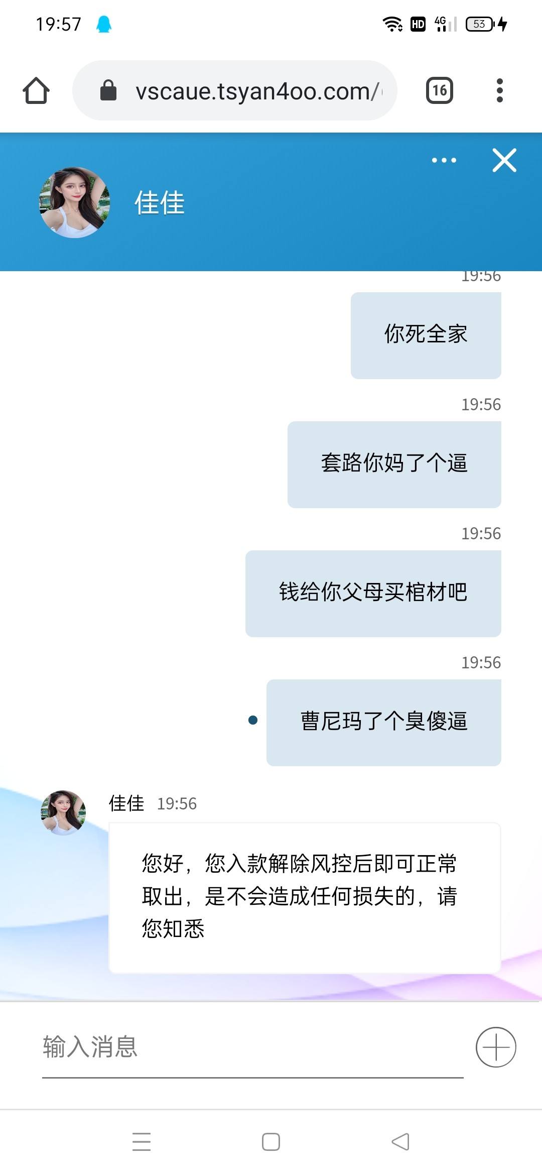 前面打电话送了6块钱,打到120出款说IP风险要我村120解冻,存了200打到1000出款又说IP风险存500解冻,给我气笑了,曹尼玛了个臭傻逼,一流直播所有工作人员不得好死!网址1616.tv