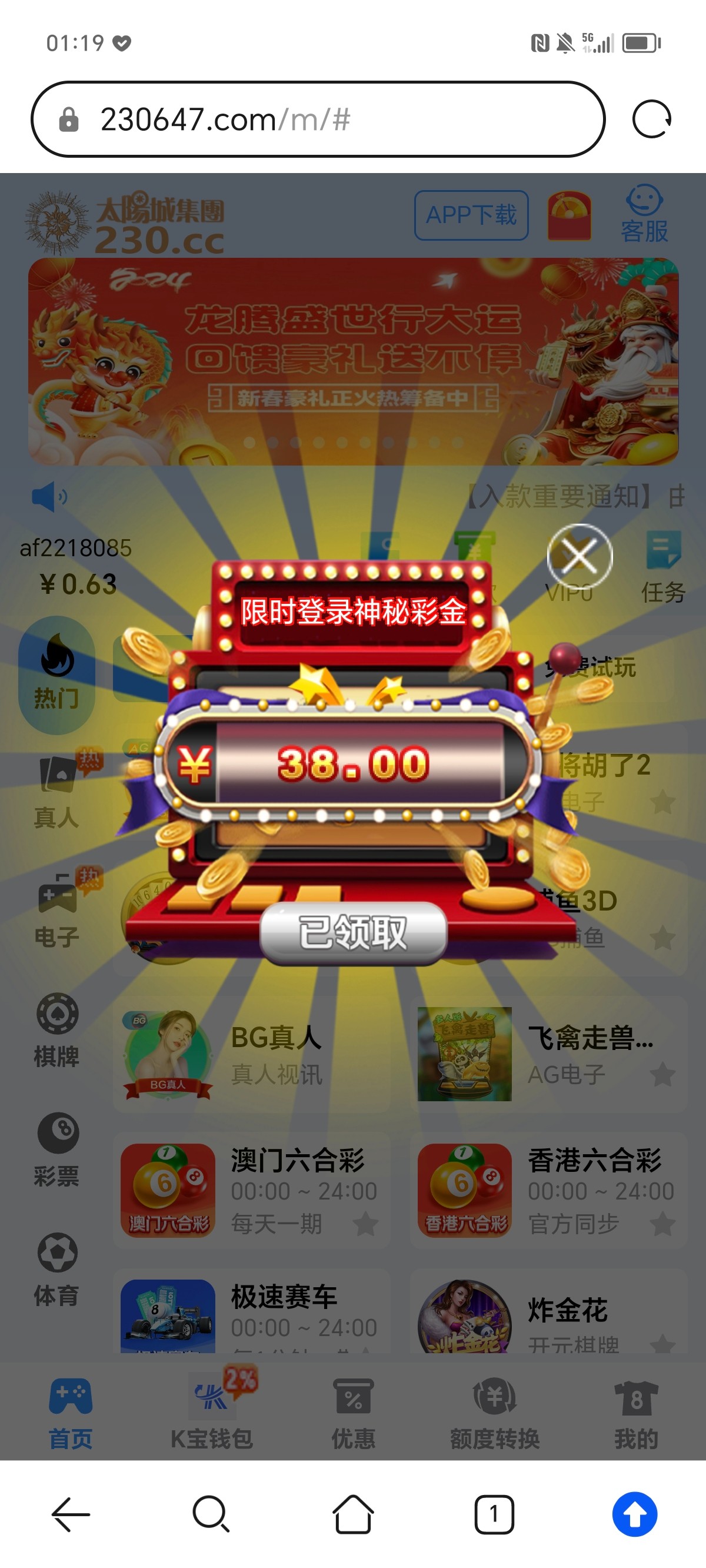 新用户无视!这个台应该很多人都注册过之前签到台,现在登录上账号能领38回馈彩金应该人人有吧,自己去看看有没有 能不能提我就不知道了