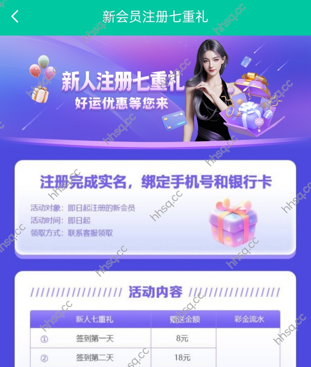 新用户注册绑卡完善资料可以找在线客服申请2天彩金,第一天8,第二天10/100提,彩金限制自行查阅网站