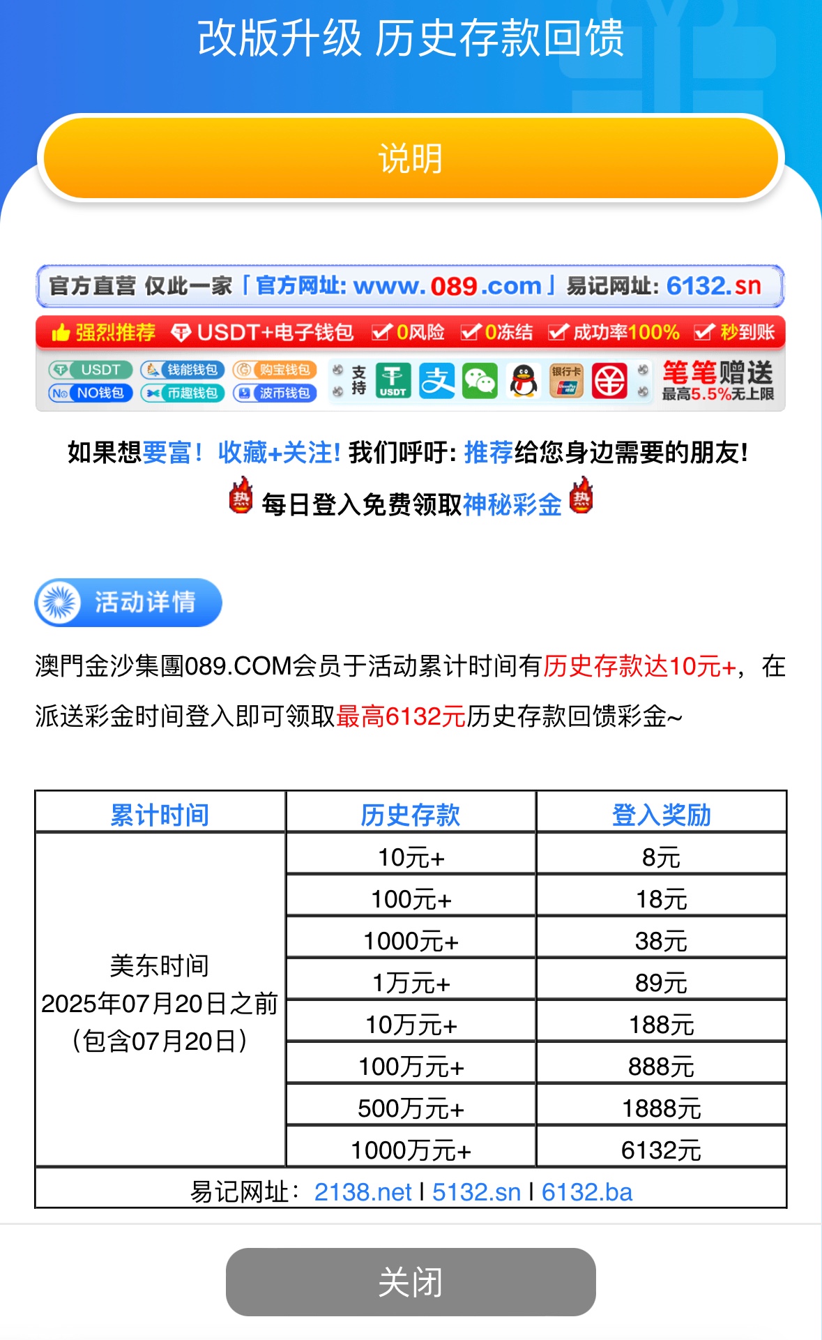 在7月20号之前历史存款10元以上的兄弟都有彩金领,符合的兄弟可以登入上去看看优惠里有没有收到