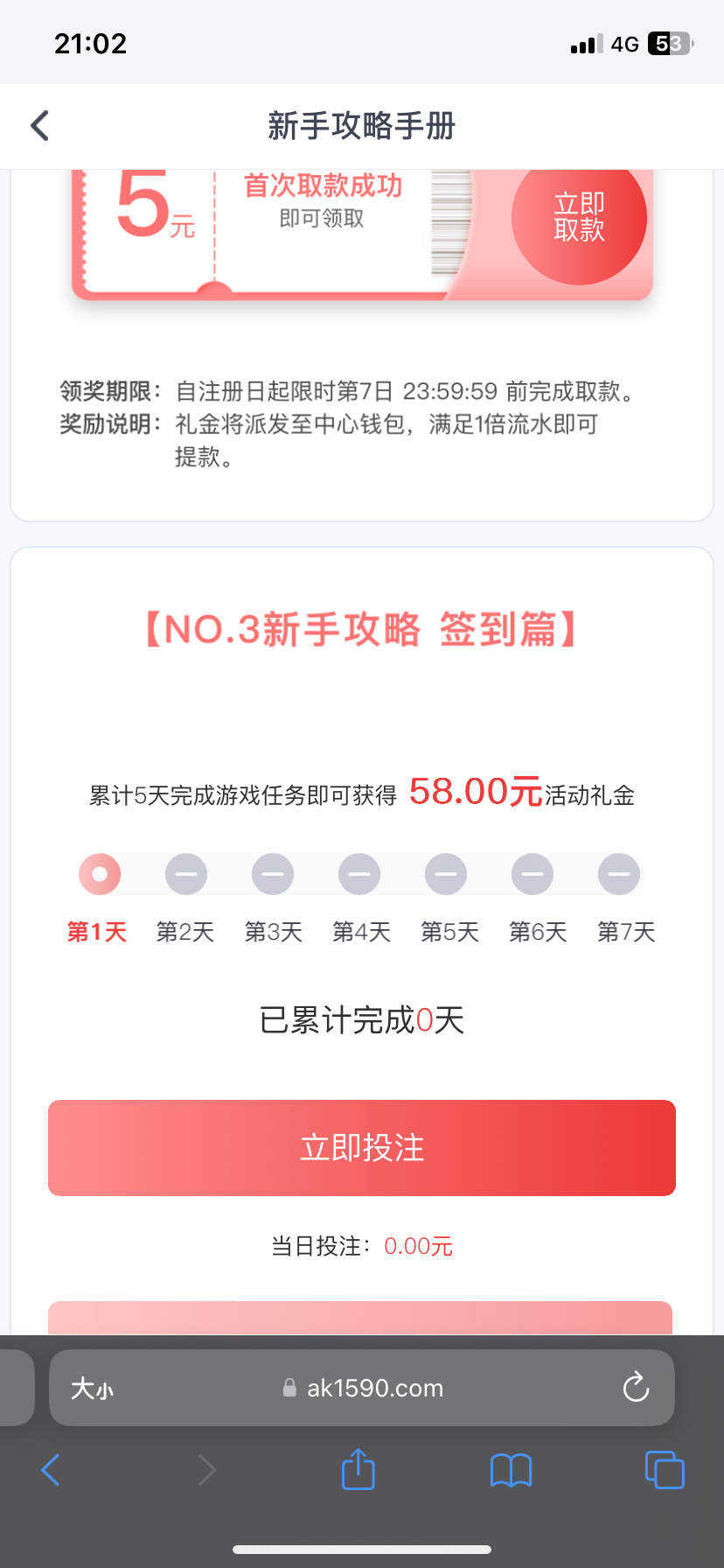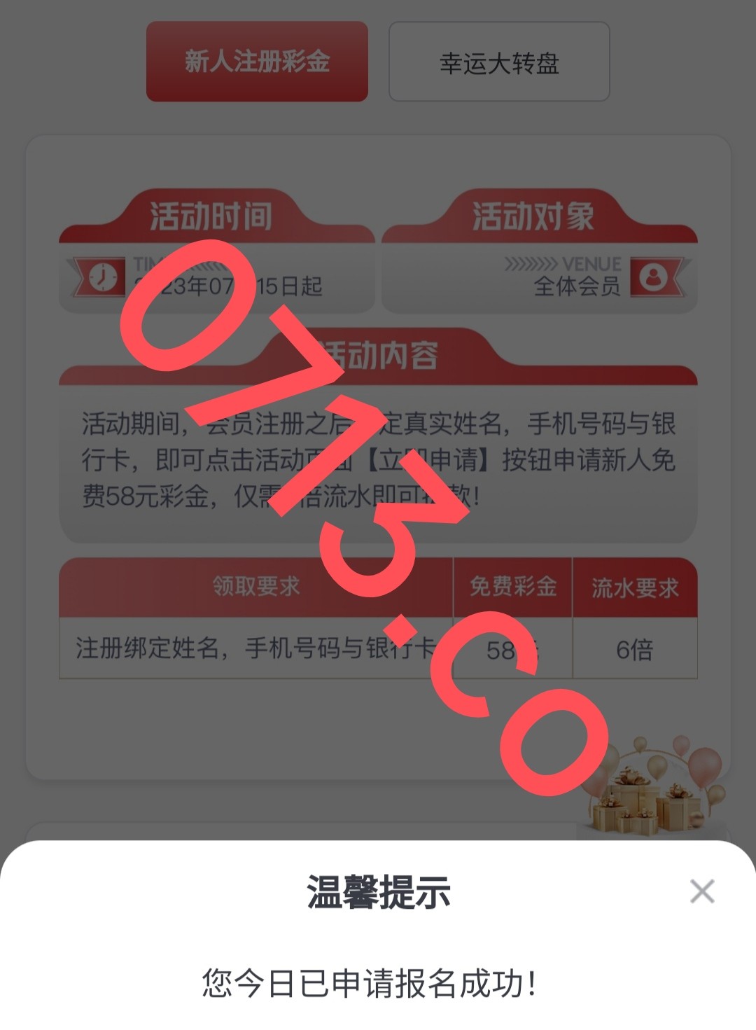 注册绑定姓名手机号码与银行卡 优惠里找到开业大庆典 申请58元 6倍流水 申请后48小时内送到福利中心领取 没有无视  跟完美体育差不多  禁止充值!