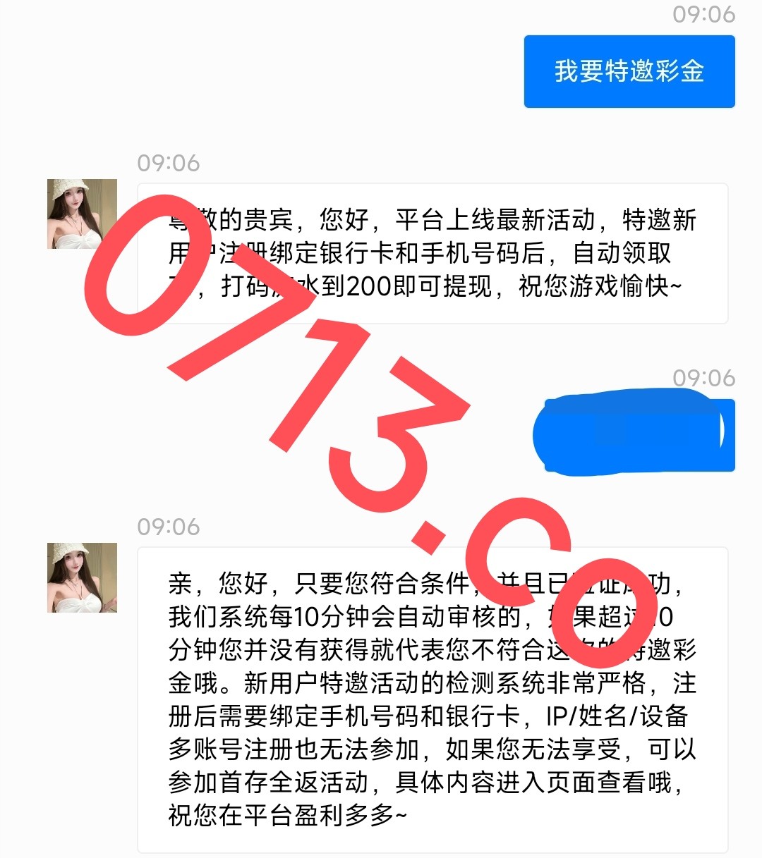 新用户注册绑定银行卡和手机号码后,自动领取39,打码流水到200即可提现只要符合条件,并且已验证成功,系统每10分钟会自动审核,如果超过10分钟没送就是不符合