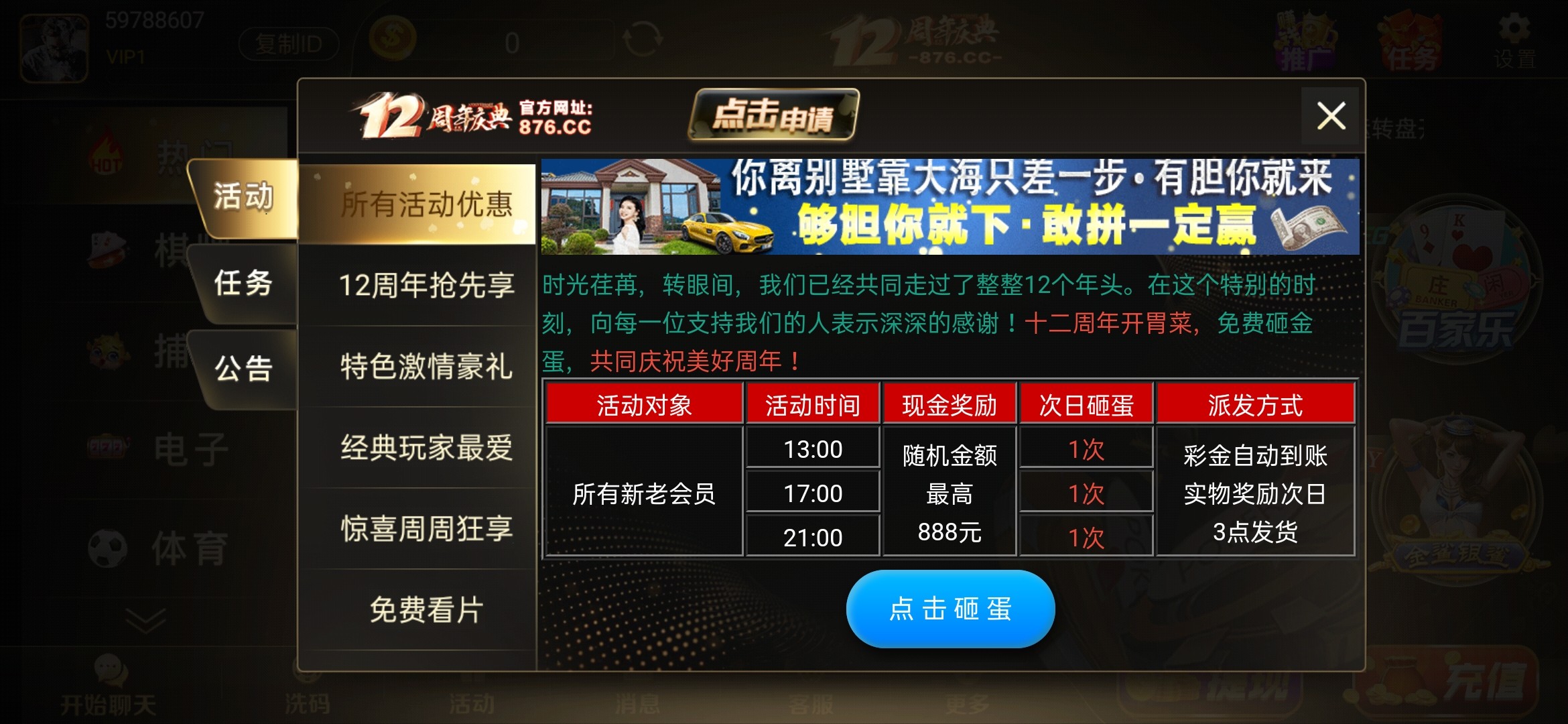 新老用户登录砸12周年金蛋,跟上次开元活动一模一样,无需充值,每日免费砸三次。