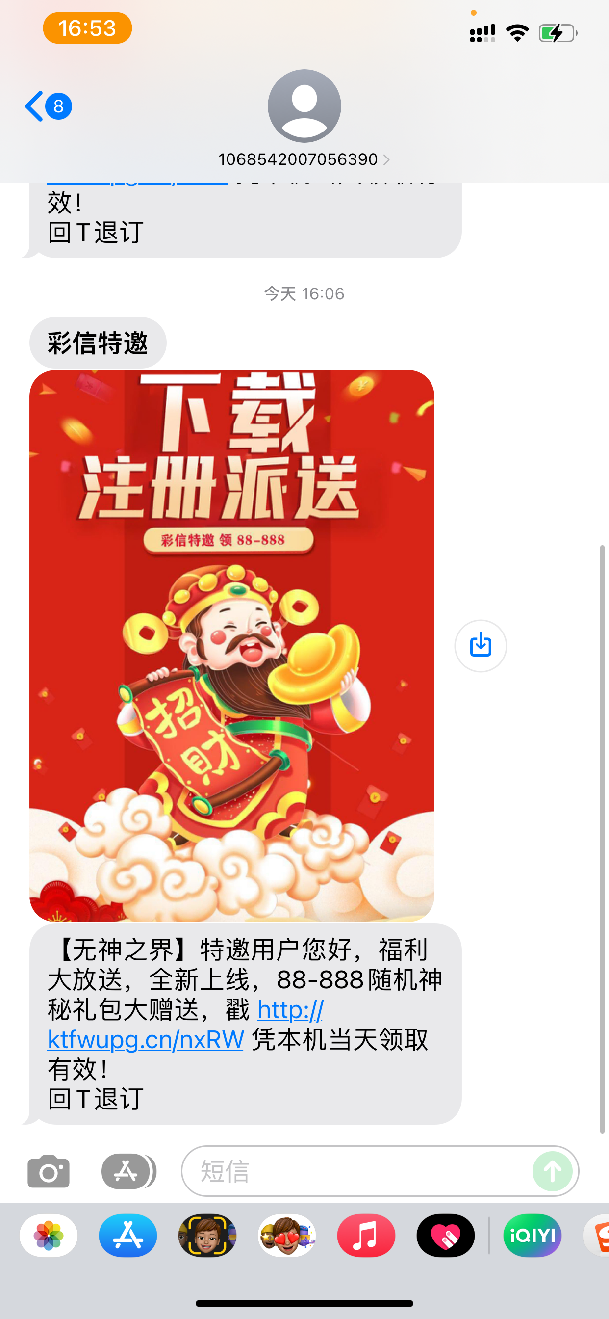 • 我也有这个短信,直接让我删了当垃圾短信了,这样的短信我从来都不点进去
