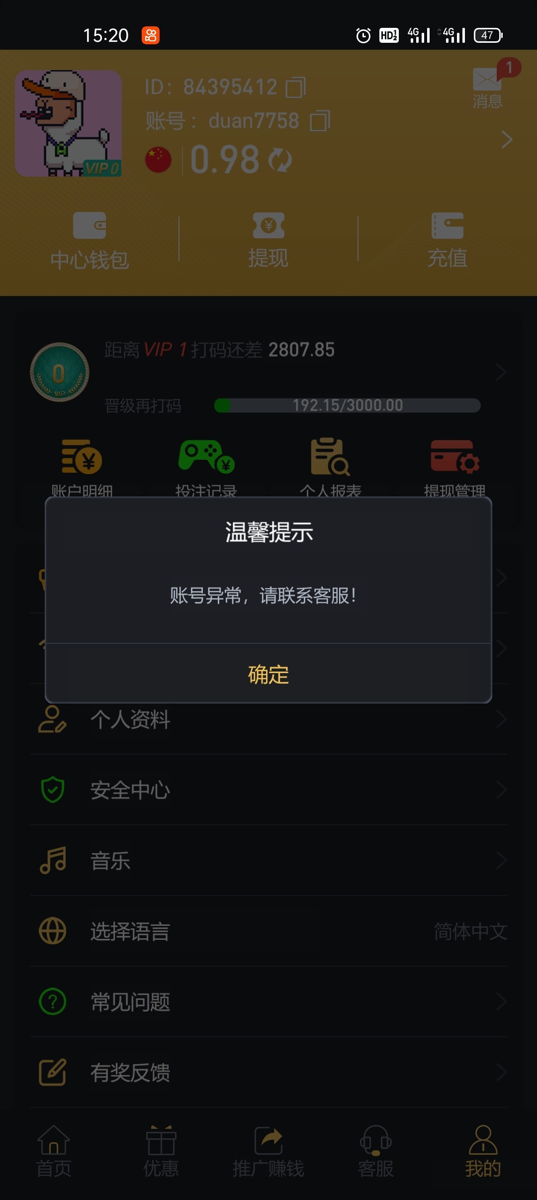 骗老哥们充值一块抢红包,充值了,抢红包抢了25提现就封号 看到的老哥千万别去搞,