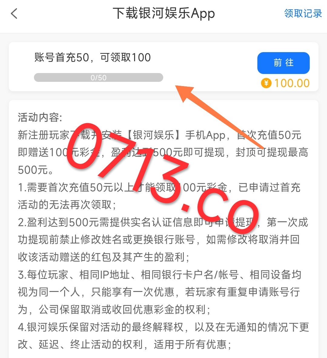 新用户注册充值50元 优惠里面自助领取100元彩金亲测领到了 无游戏限制 最低提款500元
