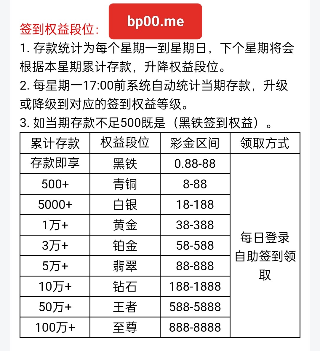 存款过的会员可以享受签到,签到的金额:0.88-8888彩金,最高只能提现288元!只能提现电子钱包!