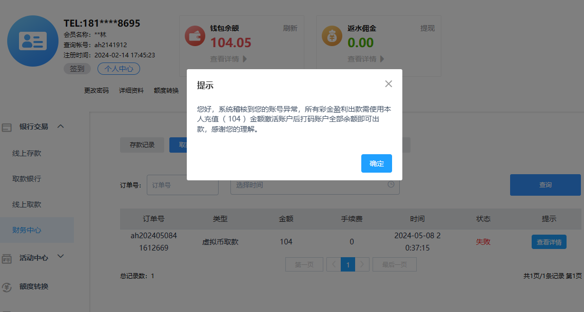 出款情况:自测(禁止充值)