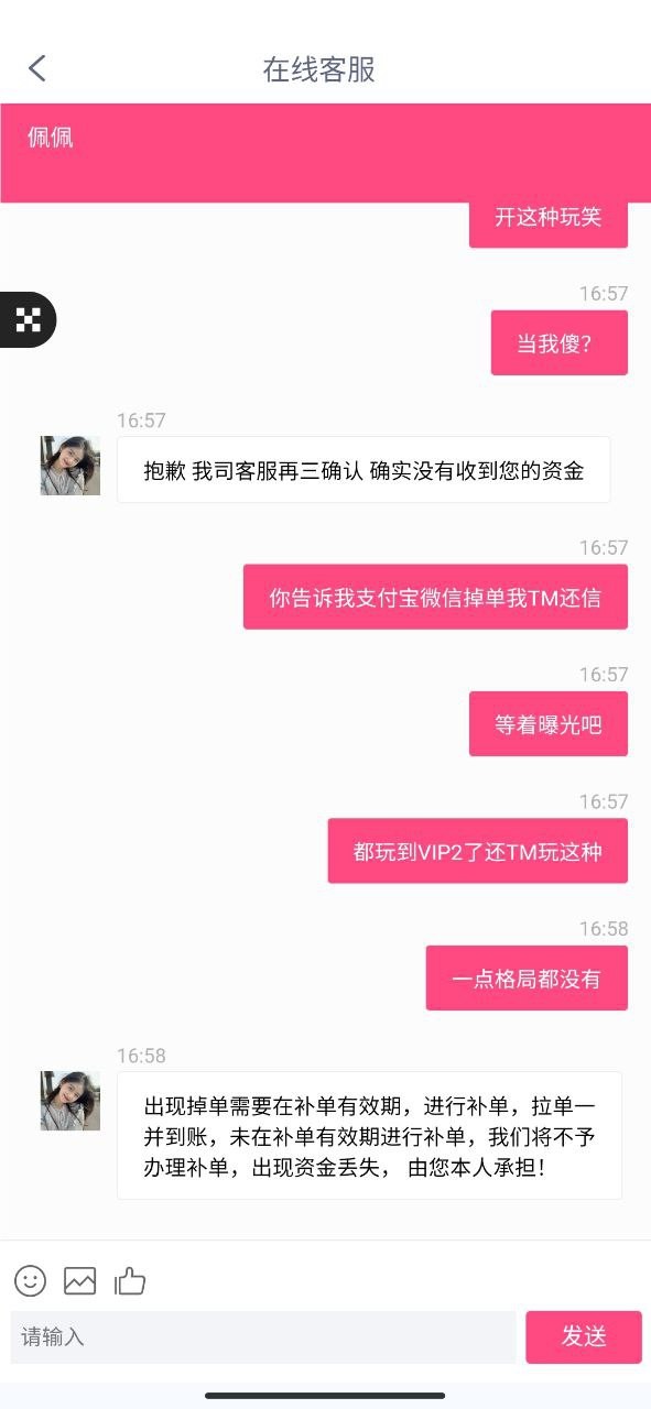 这平台我都VIP2累充不下1万了,用U充值300不到账,找客服给的理由是“掉单”! 用U充值还有掉单的吗,查链都看到地址收到钱了,还让我再冲一笔,两笔一起到账!!!