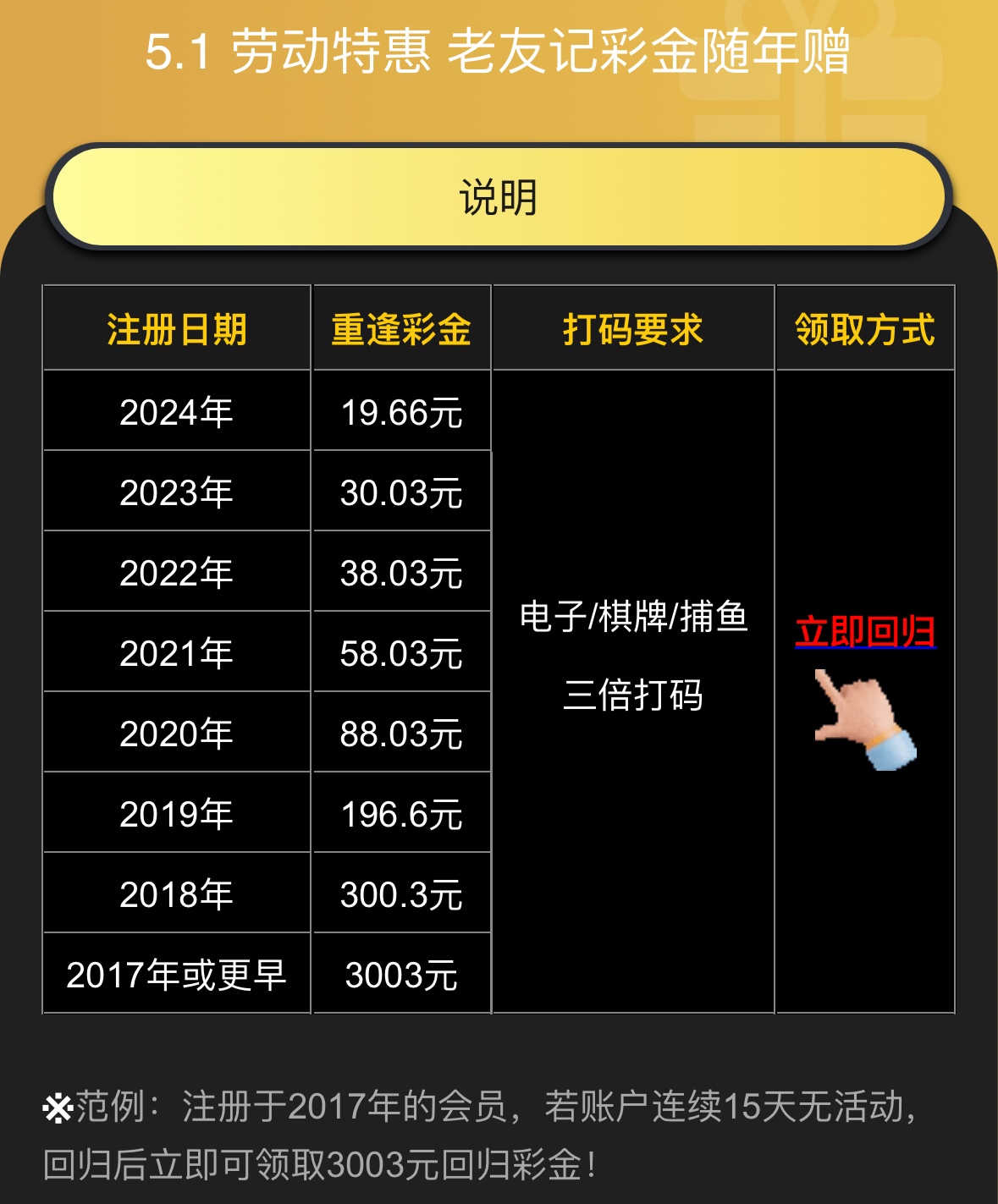 15天以上没有投注充值活跃过的兄弟可以上号联系在线客服领回归彩金,按注册年份赠送的,彩金三倍流水,限电子捕鱼棋牌