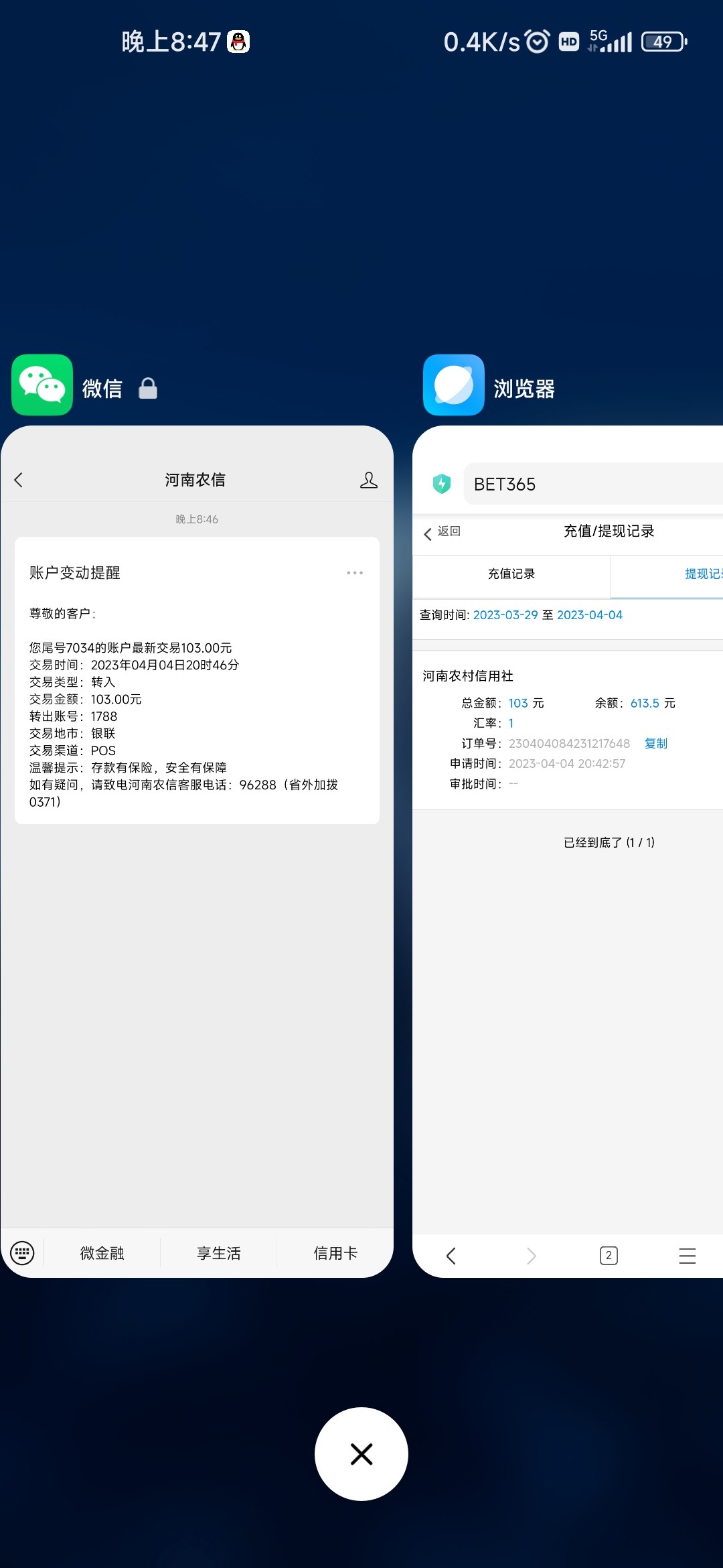 100+58   余额600了,提103到账了