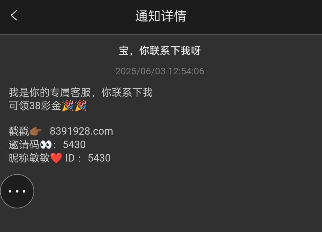 这台天天发短信有注册过的兄弟登入上去看站内信有没有收到相同信件,有可以联系专属客服领取彩金,没有无视就会!