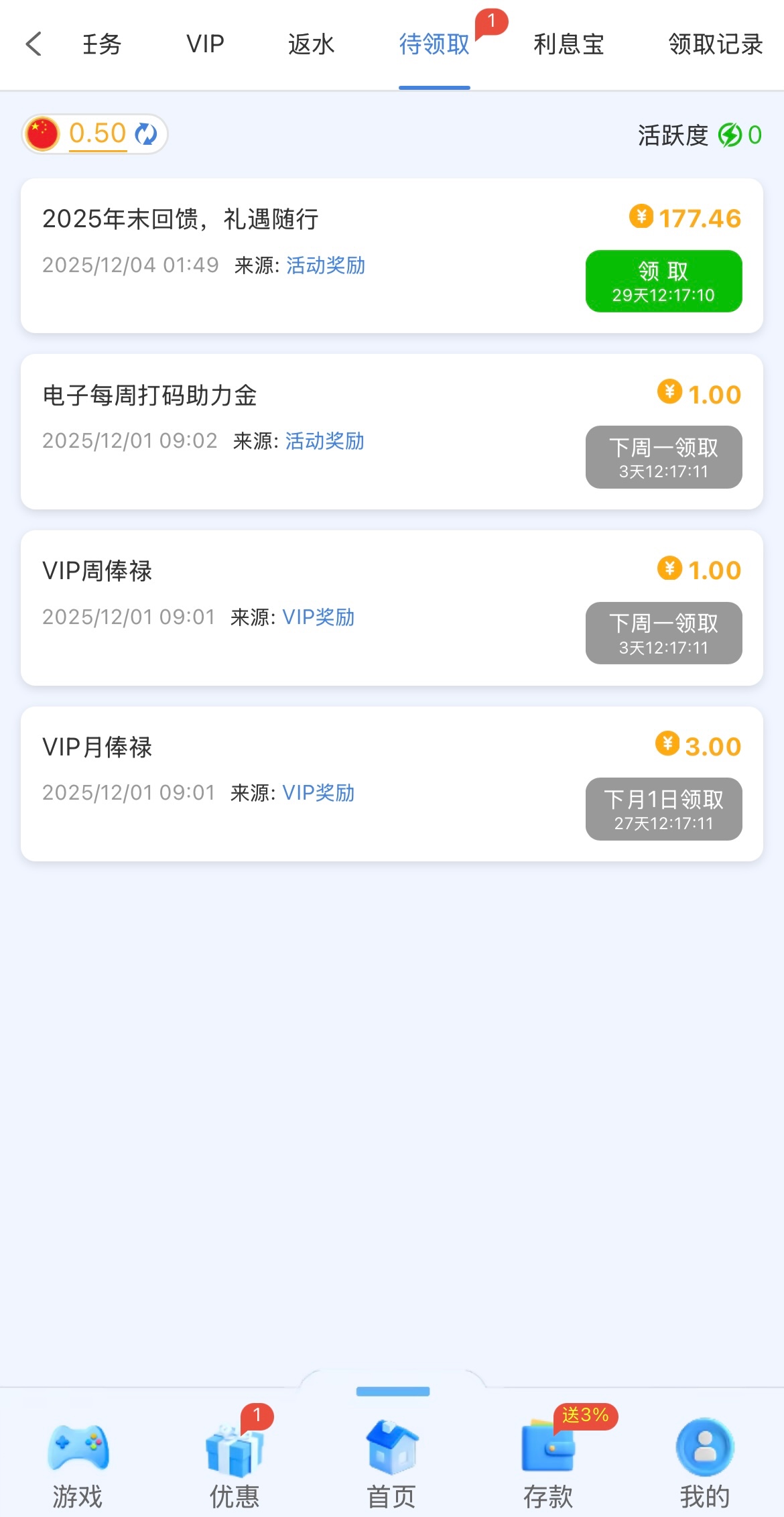 有号的兄弟可以去看看,领取彩金要近3天内充值50才能领取