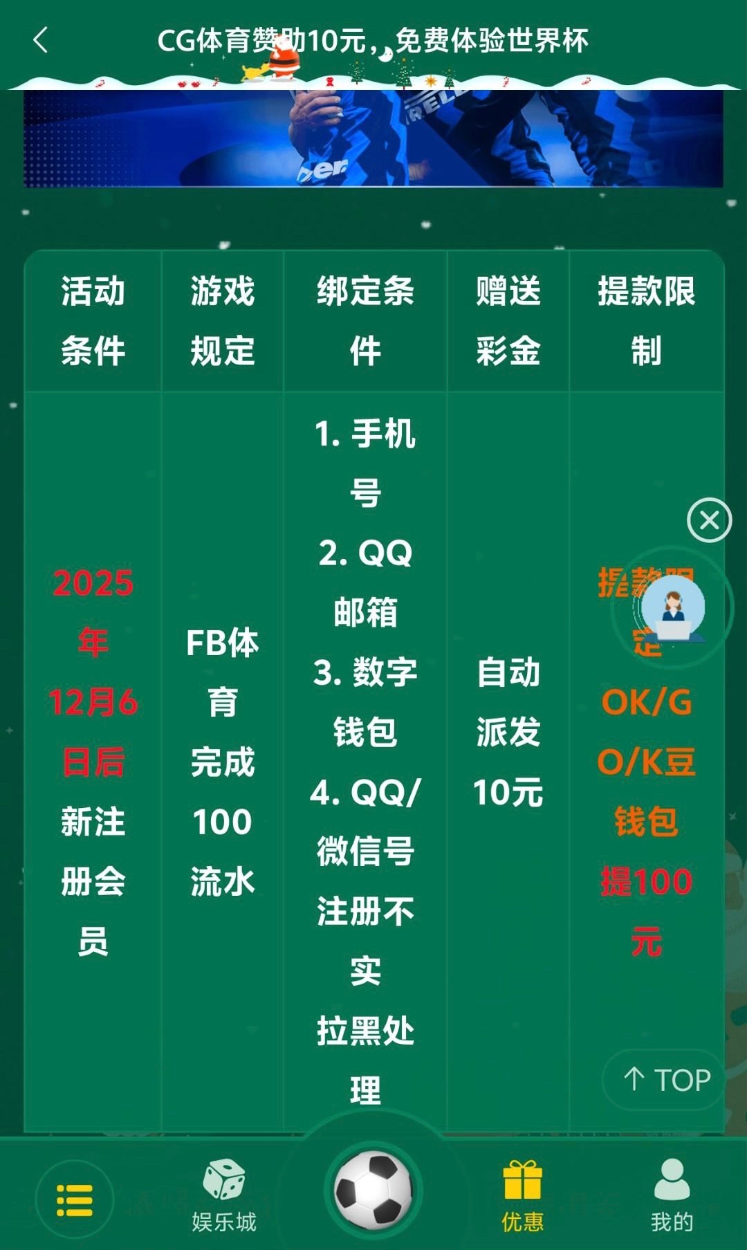注册绑定好信息自动送的,只能玩体育,要100流水