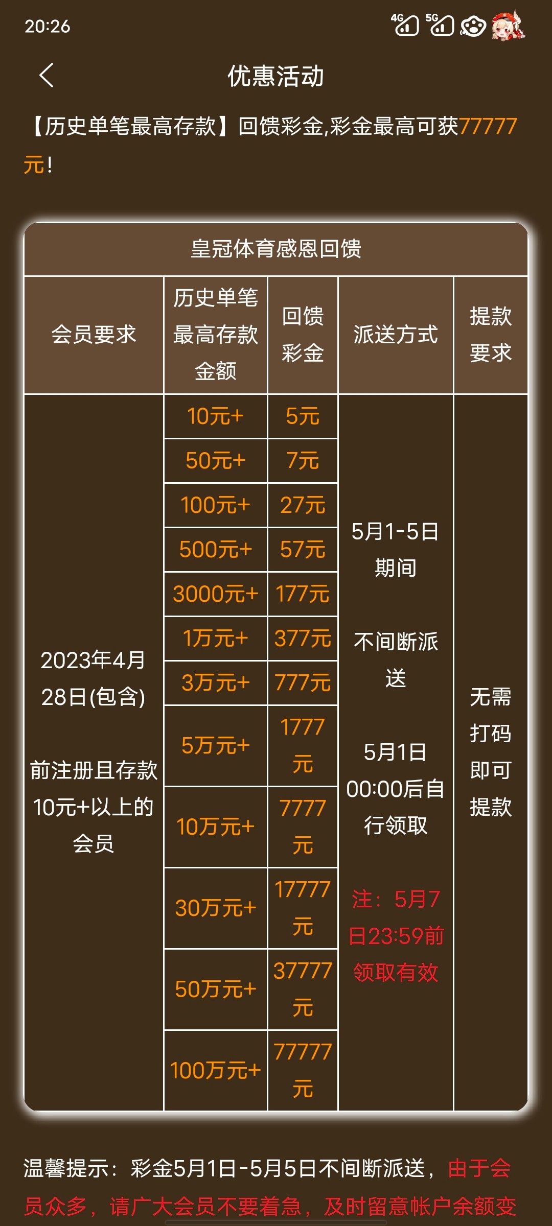 1、历史存送回馈:2023年4月28日23点59分前单笔最高充值金额回馈   5.1-5.5期间赠送