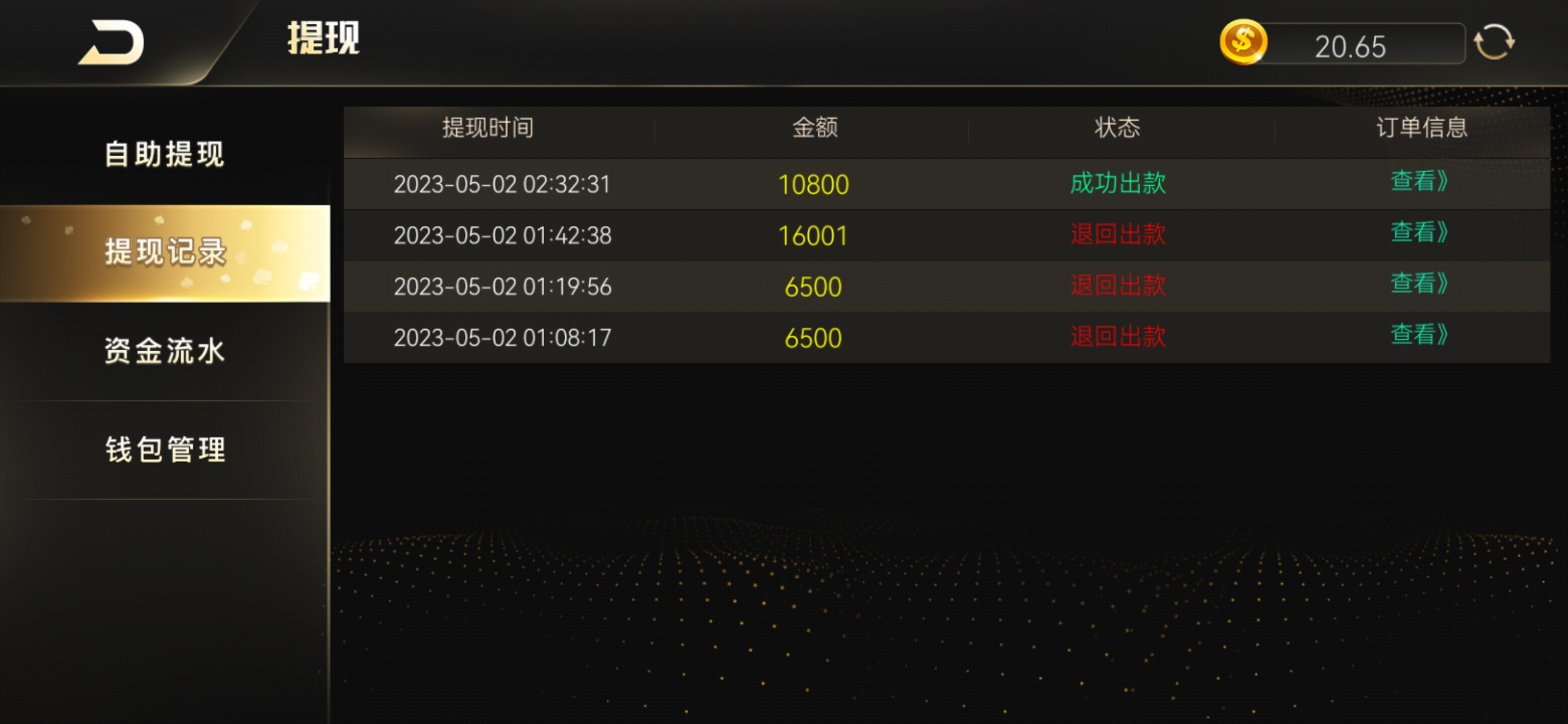开心棋牌(以前的万亿贵宾会)今天上去看了眼发现有 18 的五一会员回馈,然后去打新版五龙捕鱼爆了一个 9000 倍,四五个 4000 倍,然后提现 6500 退回叫我打 5 倍流水,打完提现 16001 还是退回再来五倍,我本来都不报希望当试玩了,没想到这次提现 10800 到账了,美滋滋!随机挑选几个幸运老哥 28.88