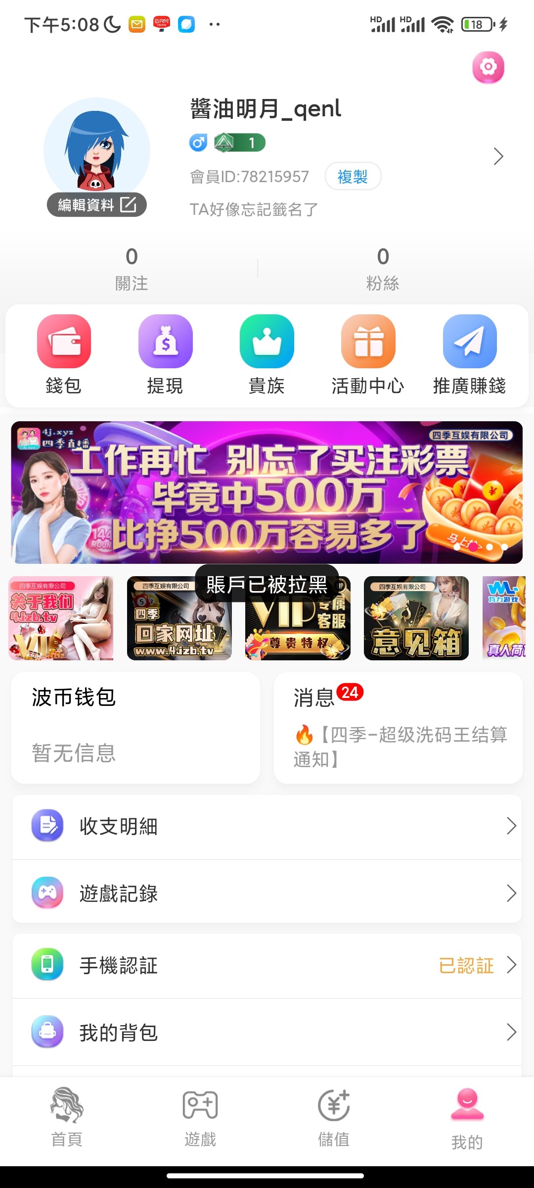 黑台,提现就拉黑,128打棋牌上了270。提现就拉黑