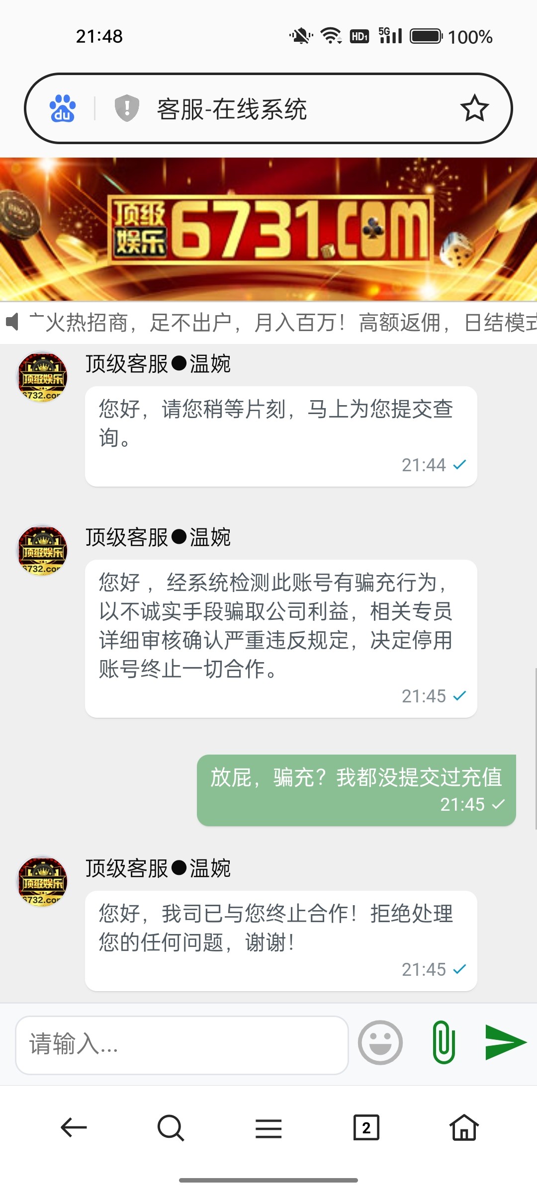 玩了挺久了,刚才提100直接封号,说我骗充,可笑的是我最近根本没提交过充值,何来骗充一说?是刚刚斗地主比赛赢的100。之前还以为顶级算这个系列中比较稳的,结果100都黑。还在玩的注意下吧