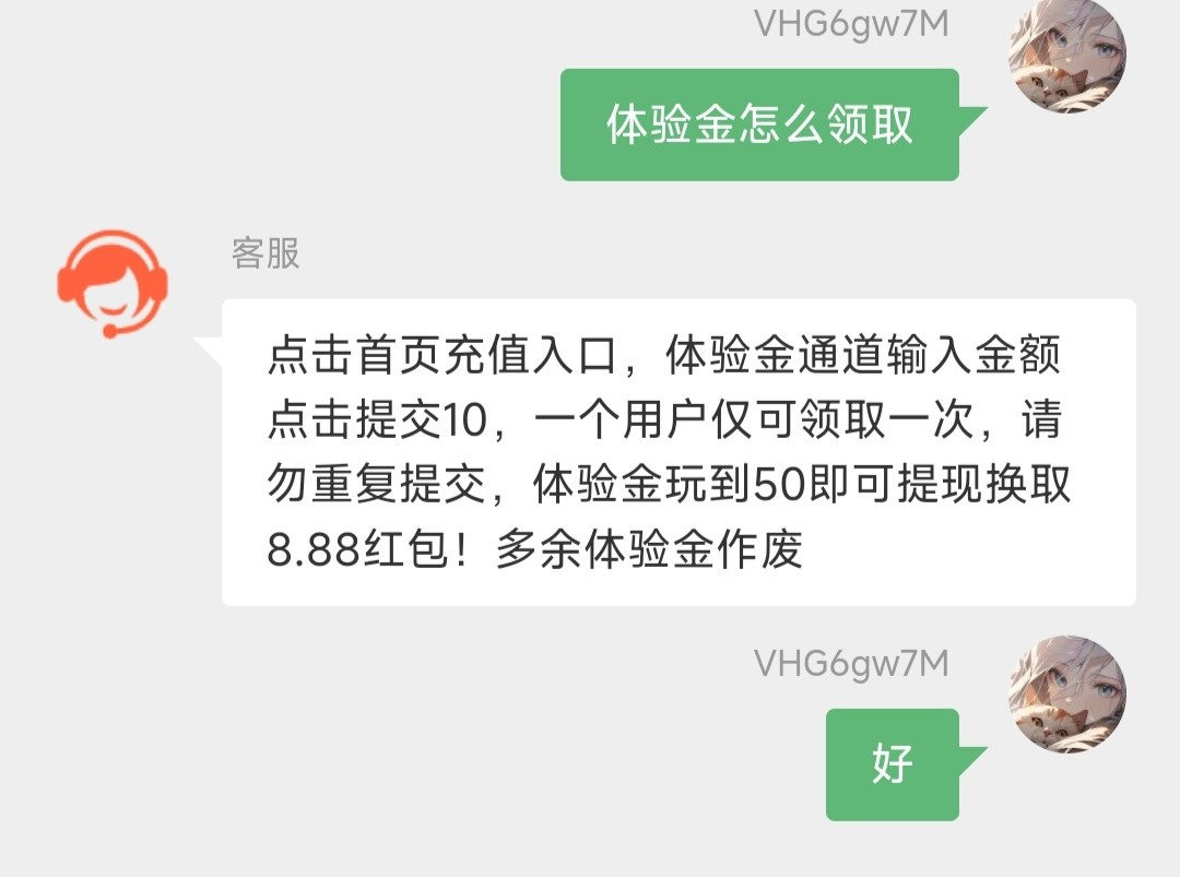 点击首页充值入口,体验金通道输入金额点击提交10,一个用户仅可领取一次,请勿重复提交,体验金玩到50即可提现换取8.88红包!多余体验金作废