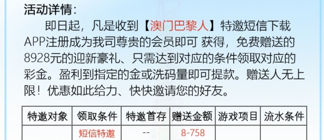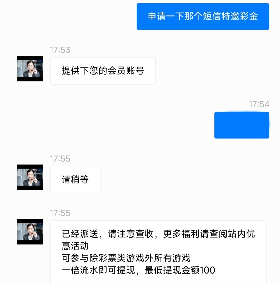 碰瓷短信特邀 还要那个合并彩金 1倍流水 除彩票其他游戏都能玩 最低100出款!亲测送8!短信图在下面